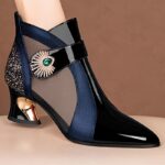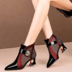 Women’s Geometric Pattern Mid-Heel Mesh Boots – Pointed Toe PU Cover & Breathable Mesh Upper, Black/Red Color Block with Sparkling Accents, All-Season Versatile Dress Boots for Casual & Formal Outfits, Stylish Heel Design | Glitter Embellishment